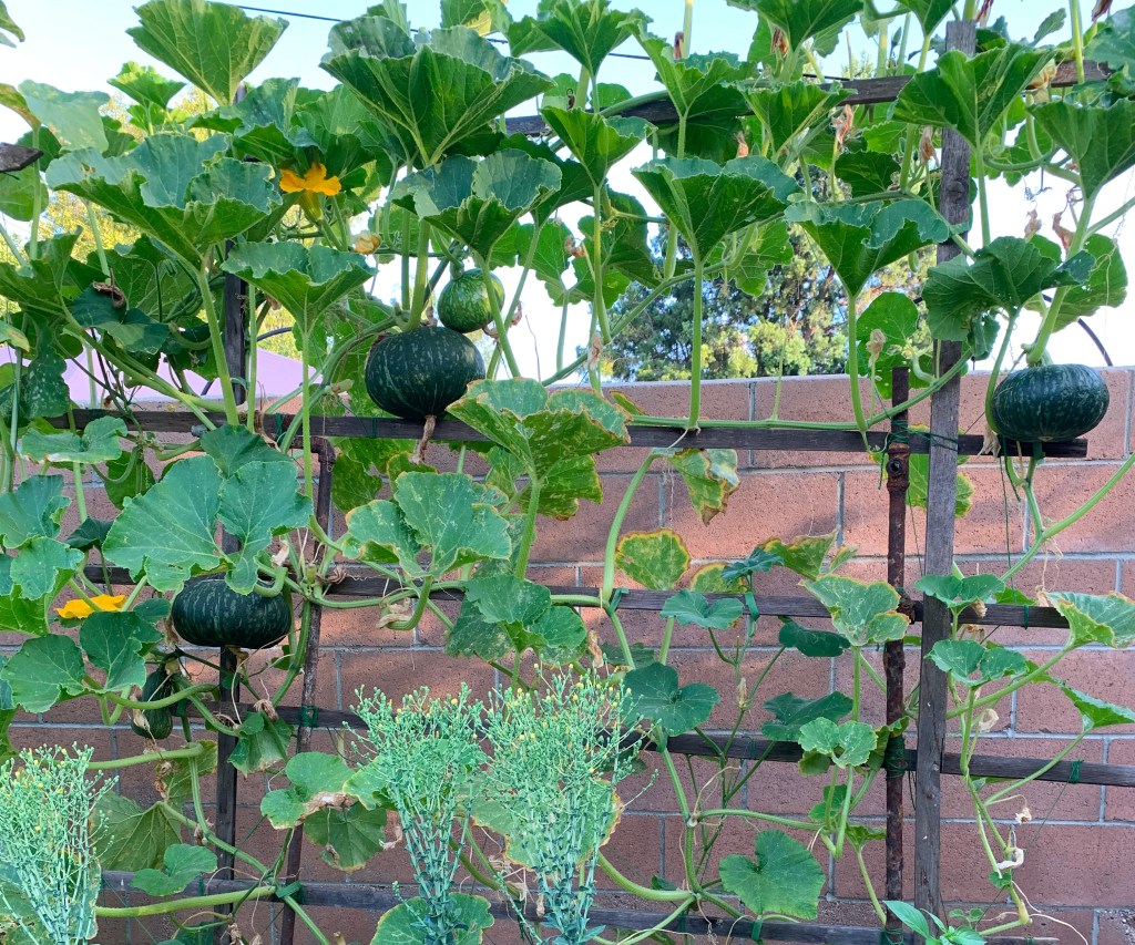 Winter squash is something we are doing different this year. We are trying a new approach of growing them vertically by putting them on a trellis. We have two Kabocha squash and two are a small butternut squash variety. The Kabocha squash took off and quickly filled the trellis up about 7 feet tall and spreading at least 6 feet wide. It looks a bit like a squash espalier.