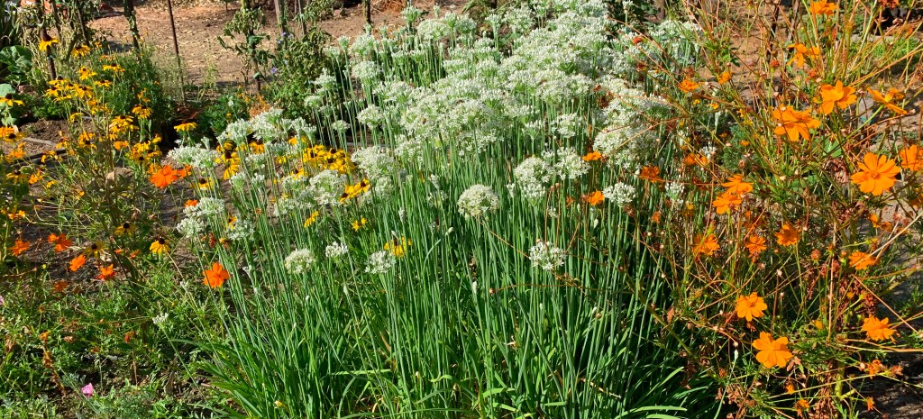 Garlic Chives are starting to flower with their round umbels of starry white flowers. The bees like having those large clusters of flowers where they can find a few meals without having to travel.