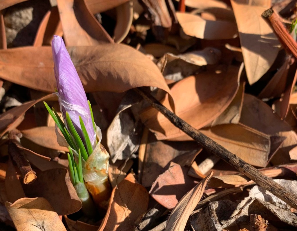 As a fun experiment, we planted 50 saffron crocus corms in October 2022. With planting on a 4 to 5 inch (10-12 cm) spacing, they fit in 8 square feet (less than 1 square meter) of garden space. A few leaves and flowers started popping up in late November. Each plant can produce multiple flowers, but this first year we had a total of 15 or 20 flowers. No more flowers after mid December, so a short harvest season.