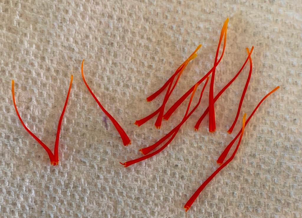 After separating the stigmas from the flowers, they need to be dried. They dry quickly, being so small and thin. Drying is done at a low temperature, around 120 to 140 Fahrenheit (50 to 60 Celsius) for about 30 minutes. Once dry enough to break rather than bend, they are ready to store in an air-tight jar until ready to use.