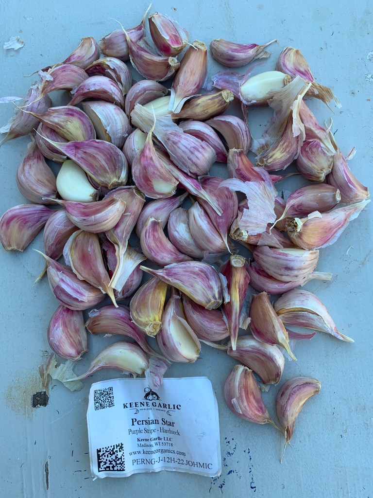 For hardnecks, we have 3 of the “purple stripe” type. Those are Chesnok Red, Dunganski and Persian Star (couldn’t resist planting one with that name). As their name implies, these typically have a bit of nice red/purple stripes coloring the skins. You can see that in the photo at the top of this post and the photo on the right. These averaged about 10 to 12 cloves per head. Larger cloves than the softneck and not as many.