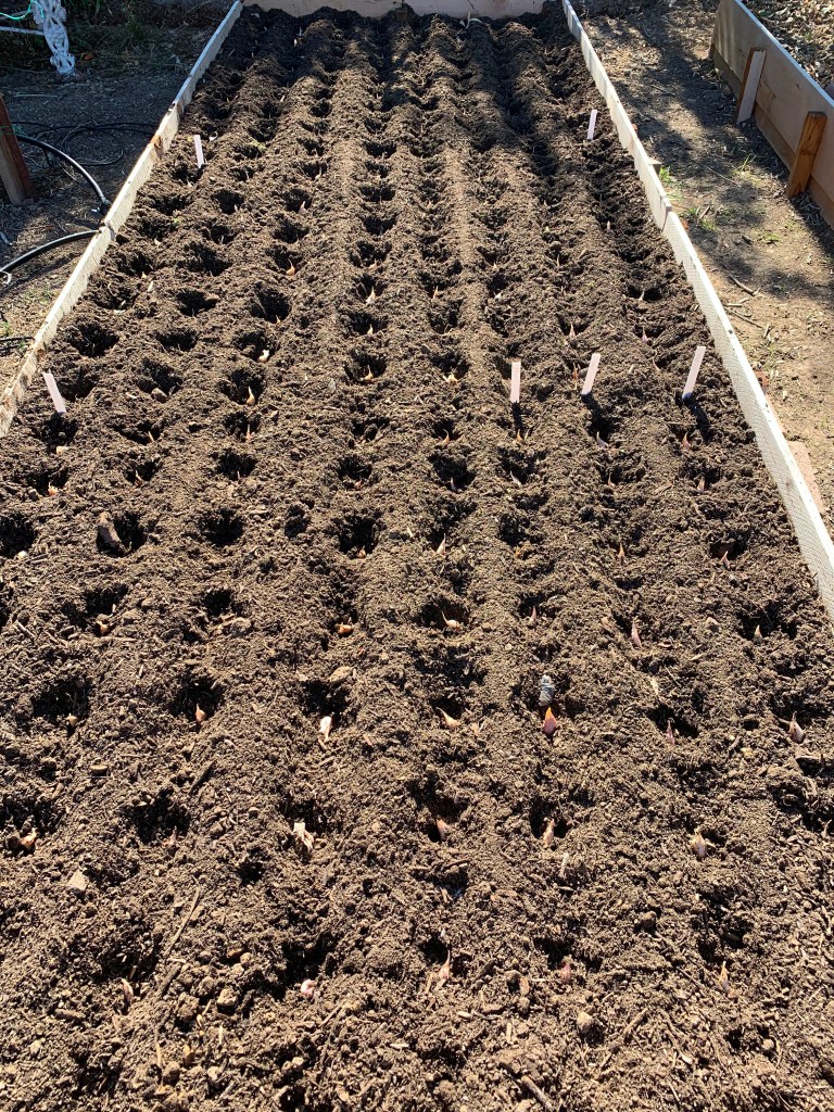 We laid out rows for the garlic at about 6 inch spacing and planted garlic cloves about 5 inches apart in the rows. Digging shallow trenches for the rows made it quick to push the cloves in the soft ground so they would be 2 to 3 inches below the surface when the trenches were covered.