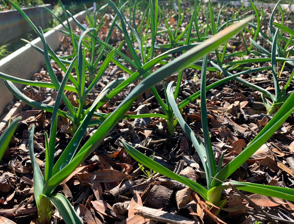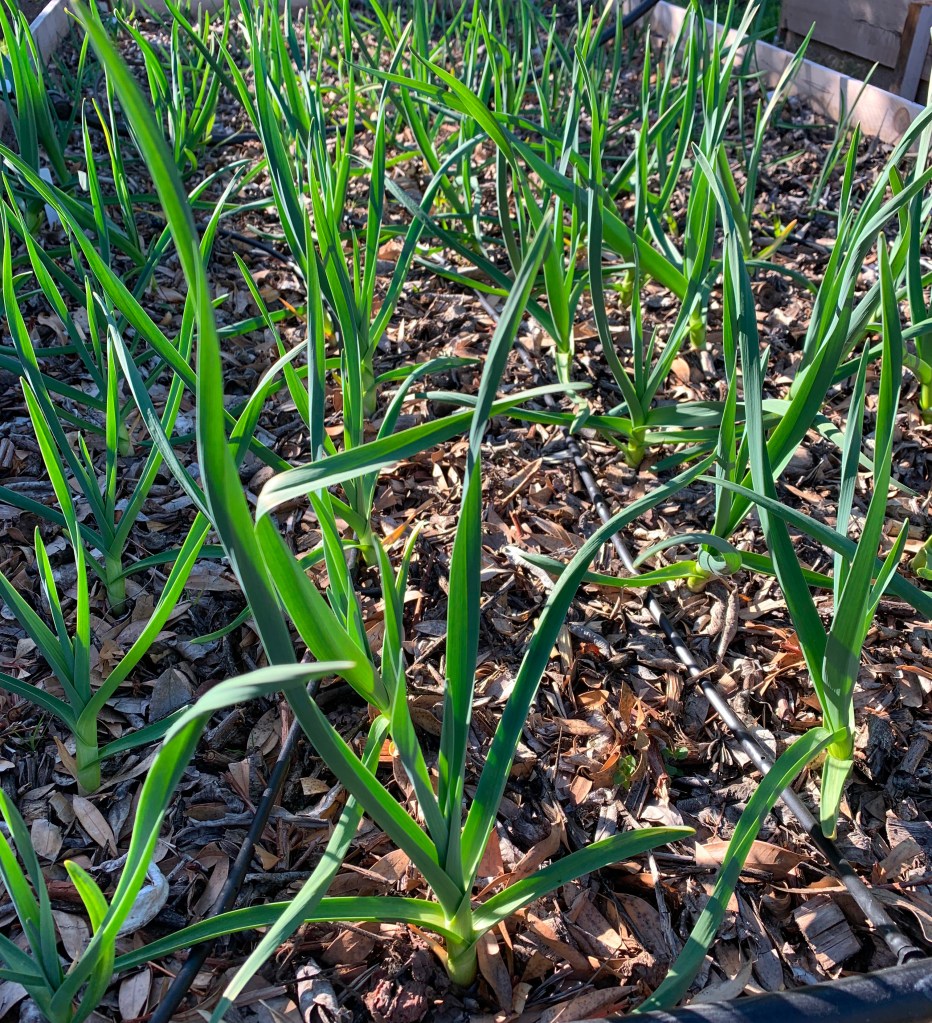 Once they were all planted the bed was covered with mulch. We watered them in well after planting to get them off to a good start. In our relatively warm winter climate, they came up quickly, both softnecks and hardnecks.