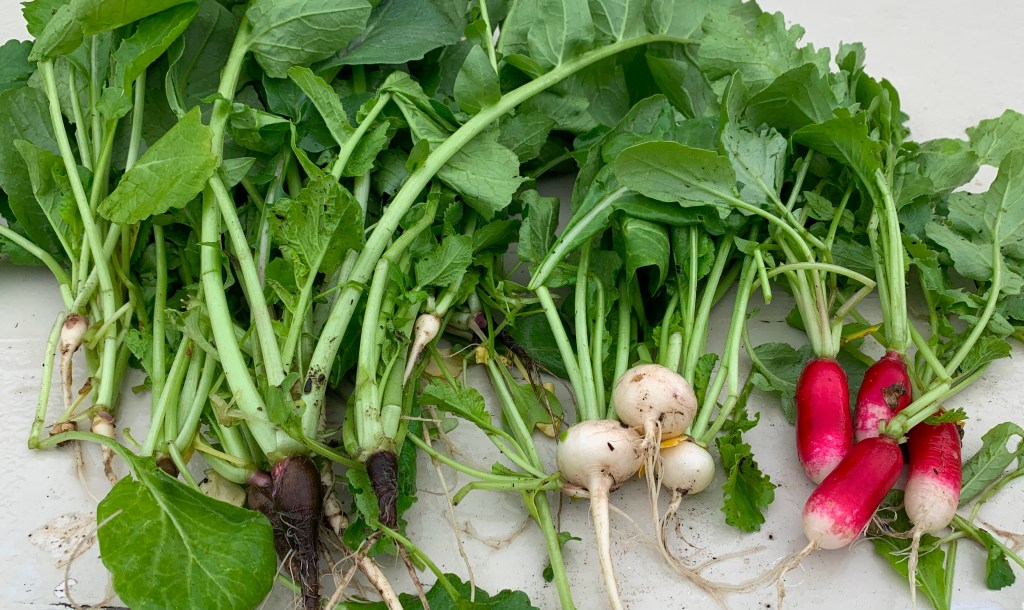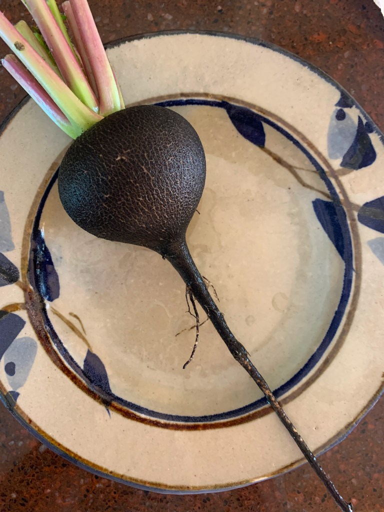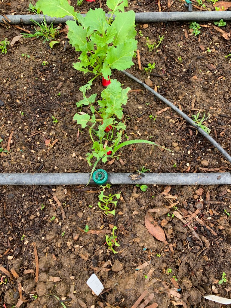 Black Radishes are also doing well. They take longer to mature and grow more like turnips than radishes. The leaves and roots get larger than other radish varieties. With their strong pungent bite they are a bit intense for eating fresh. We tend to use them in combination with other foods, or pop them in a green smoothie for a little extra zip.