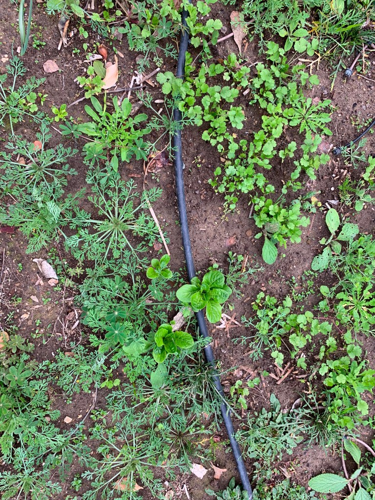One of our flower and perennial beds has a good crop of cilantro, lettuce and wild arugula coming up along with lots of California poppies, lupine and borage.