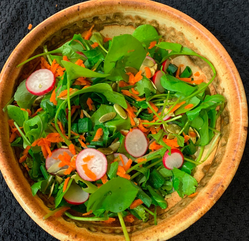 Salad of Miner’s lettuce, arugula, radish, carrots, green onions and pumpkin seeds