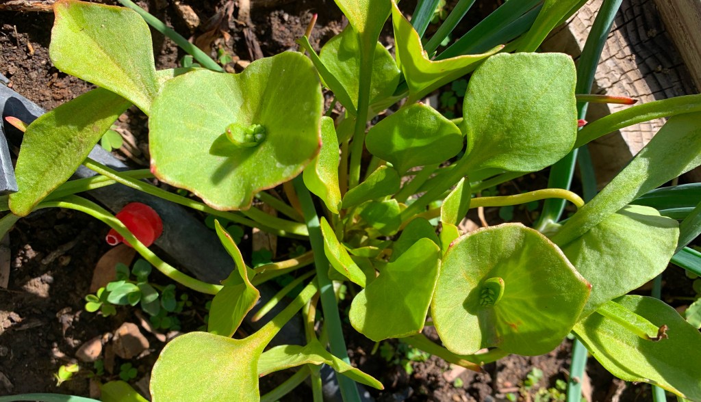 After our good rains in January we have lots of Miner’s lettuce (Claytonia perfoliata) popping up around the garden, even in our vegetable beds. It is a native plant in Western North America ranging from Southern Alaska and Canada all the way to Central America. The name comes from the California gold rush miner’s eating them as a green to help prevent scurvy. It is a nutritious green with high vitamin C and vitamin A content.