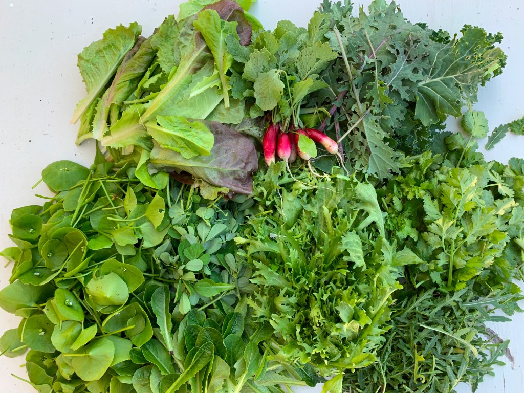 Greens and radishes are the main garden produce this month. In the photo above starting at 12 o’clock and going clockwise we have French breakfast radish, kale, cilantro, wild arugula, frisee, fenugreek (toward middle), baby lettuce (toward bottom), Miner’s lettuce, and various leaf lettuce (mesclun).