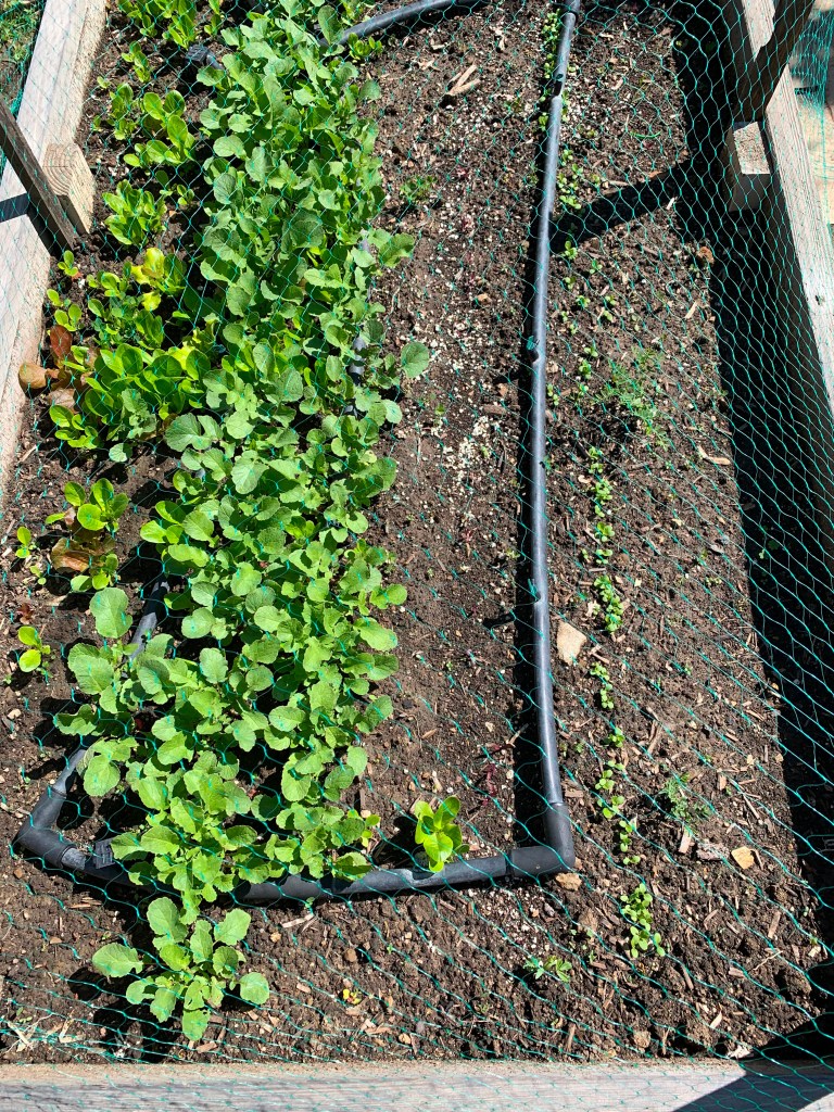 One of the problems we wrote about in our February update was our seedlings coming up then disappearing. The evidence pointed to our ground feeding, seed eating birds (sparrows, towhees, juncos). We now have bird netting over newly seeded beds and we are seeing better survival of seedlings, like the beets and lettuce on the right side of this bed. The radishes in the middle are almost ready to harvest and the mesclun lettuce mix on the left will be ready to start cutting soon.