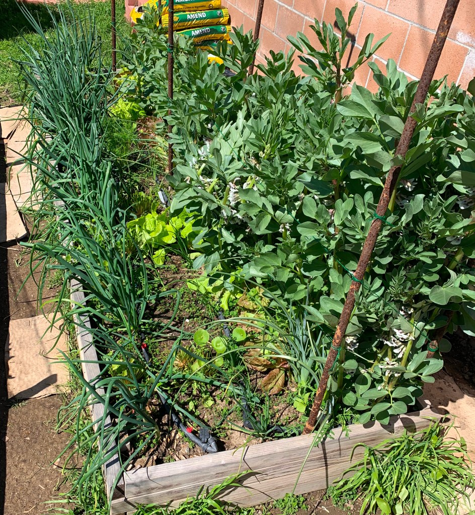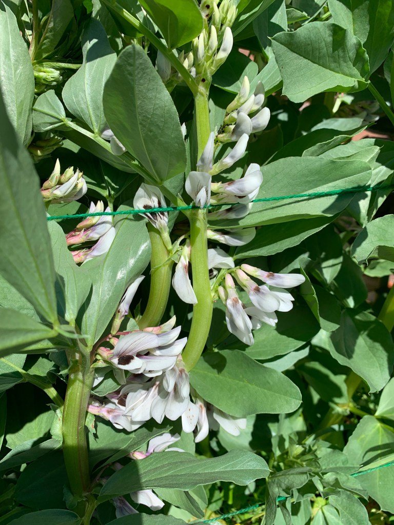 In addition to eating the large mature beans, the young shoots are edible as greens, similar to pea shoots and the young beans can apparently be eaten with their pods. We are growing two varieties, Windsor (a good reputation for eating) and Sweet Lorraine (mostly used as a cover crop, with smaller beans). They are thriving and filled with flowers. Since they are legumes, they will be adding nitrogen to the soil. We’ll also use all that good green growth as compost fodder.
