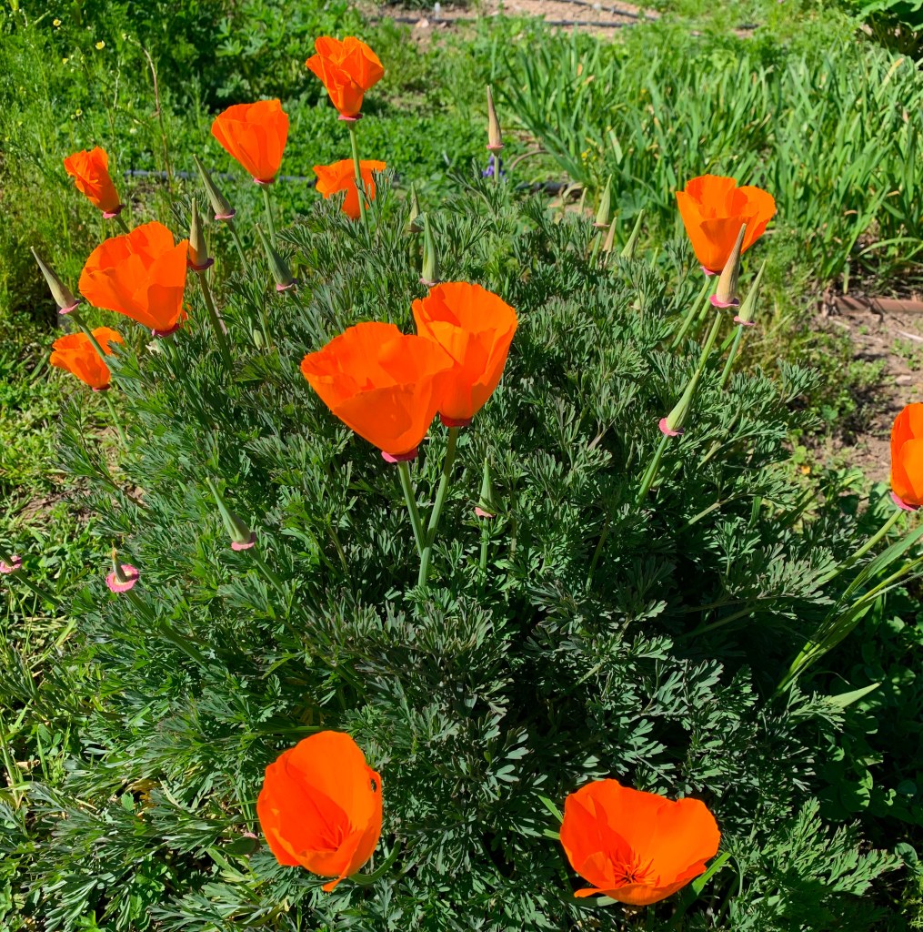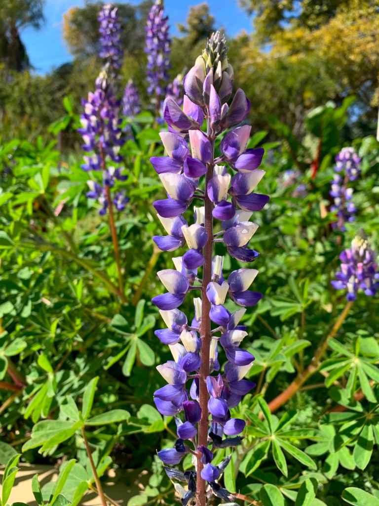 Lupines are another great self-seeder. When their seed pods get dry they literally pop open and shoot the seeds all around, similar to the poppies. These two wildflowers are growing in much of the garden. The lupines are quick to go to seed and plants die back fairly soon, so we let many grow and give us nice color in the garden. We have some big black bumblebees that seem to have a strong preference for those lupine flowers. We have also found Allen (Allen’s hummingbird) visiting lupine.