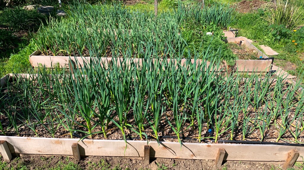 Our garlic and shallot plantings are going great. The photo below shows the 3 beds with garlic in them. The front bed has 3 varieties and they clearly have different growth styles (they were planted at the same time). On the right is Persian Star, middle is Music, and the left is Chesnok Red. All 8 garlic varieties we planted are looking very healthy and vigorous.