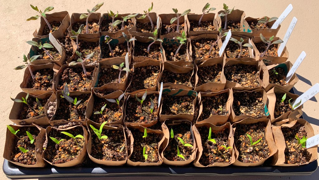 Some garden work was delayed due to the wet conditions. Indoor seed starting for spring and summer is progressing. Summer tomato, eggplant and pepper starts are up and growing. For some starts we are using recycled paper pots we wrote about in an earlier post.