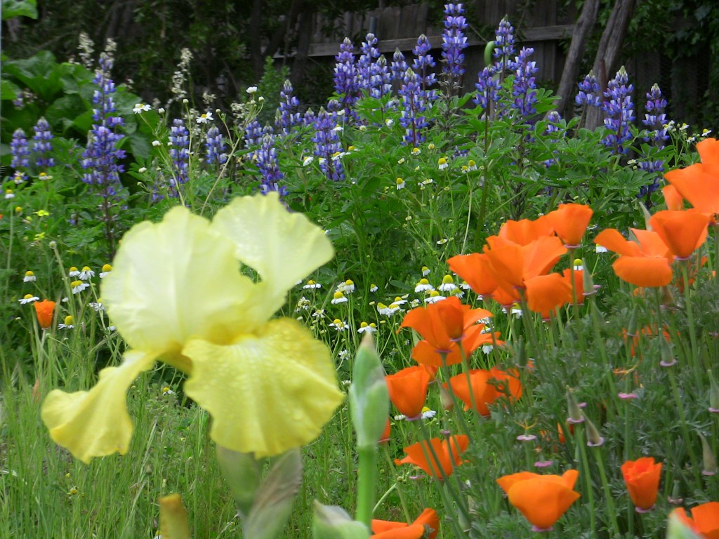 Yellow iris, purple Dutch iris, white and yellow chamomile, red and white flax, blue borage, lavender (in lavender of course), white lemon flowers, red/orange pomegranate flowers, and more are creating quite a colorful display.