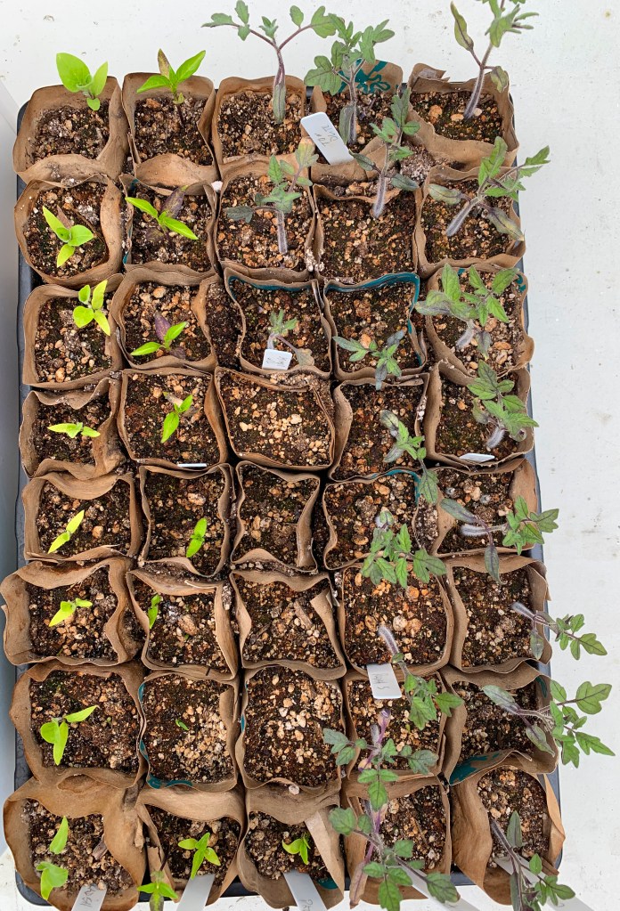 Tomatoes, eggplants and pepper starts got transplanted to their summer homes. Other seedlings are growing quickly, so we’ll be busy getting everything into their beds.
