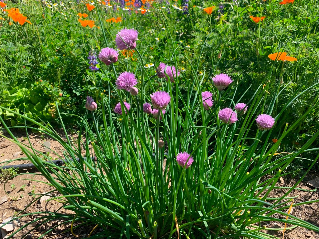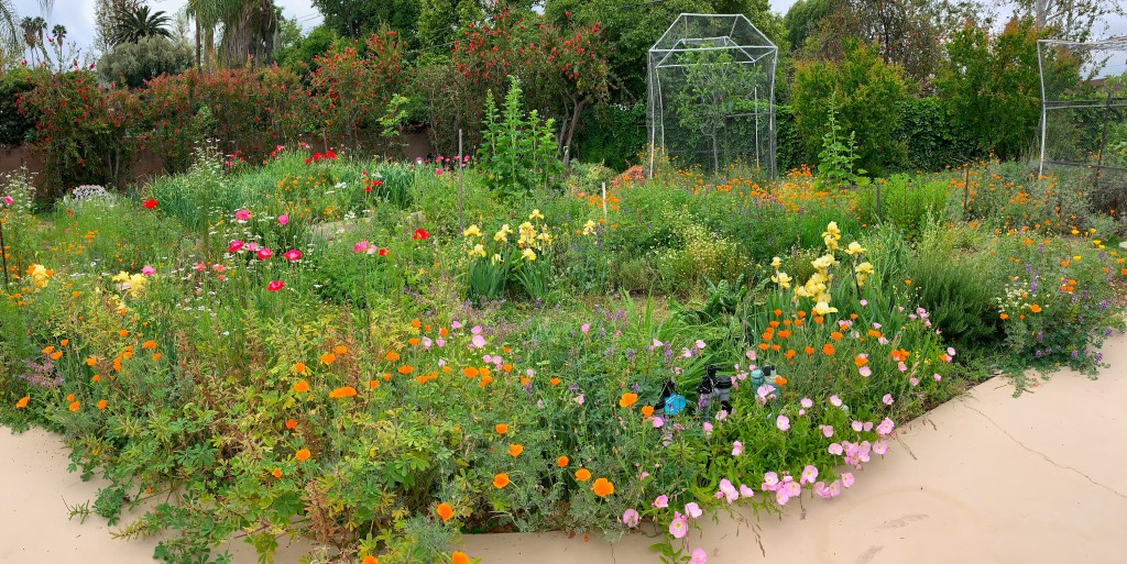 Spring flowers are in full bloom. Lupine and California poppies have taken over many of the garden paths. We enjoy the wonderful color they bring, so let them run wild for now. They will start going to seed in a few weeks and we’ll clear the paths as they die back.