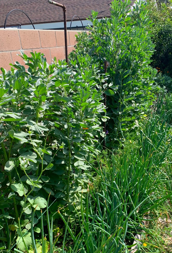 One new thing we are harvesting this year is the fava bean shoots. The fava beans are quite vigorous, now up over 6 feet (2 meters) tall with multiple stems per plant. We heard the young shoots are edible as greens, so we’re testing them out (they cook up something like spinach with a fairly mild flavor). A few of them are on the lower right of the photo above. The stems up to about 1/4 inch (5 mm) are still tender. For a quick and tasty recipe, try our Asian style fava greens.