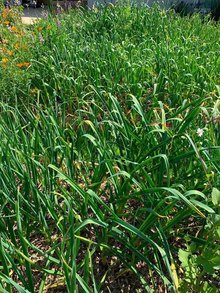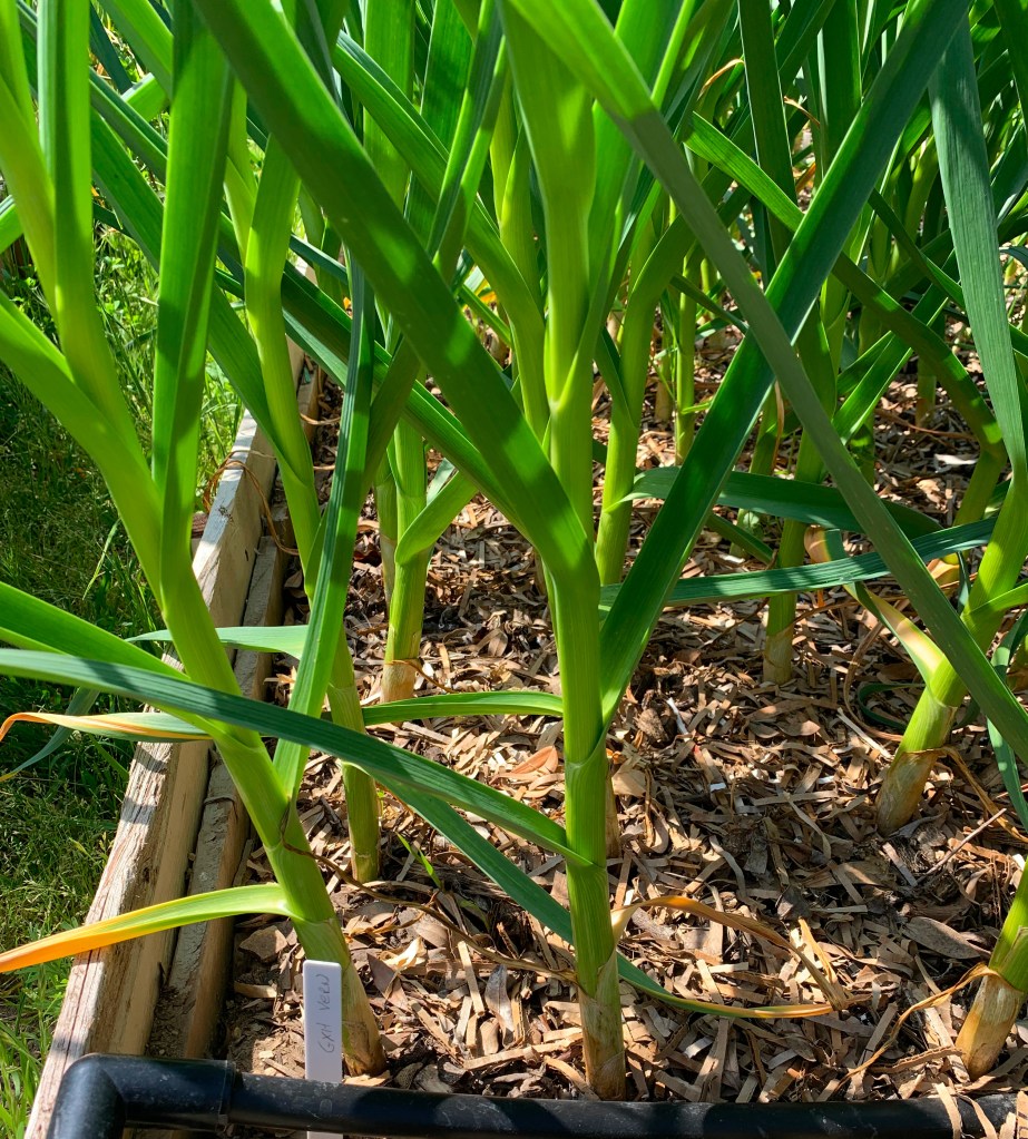 Our garlic and shallot plantings continue to grow well. The photo below shows the 3 beds with garlic in them. All 8 garlic varieties we planted are looking healthy and vigorous. The tallest (porcelain varieties) are now about 3 feet tall (1 meter). Stems are nice and fat. They should be making nice large garlic bulbs.