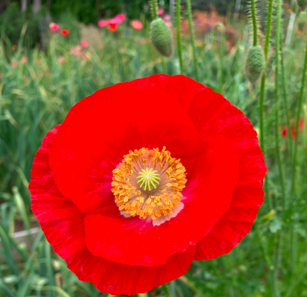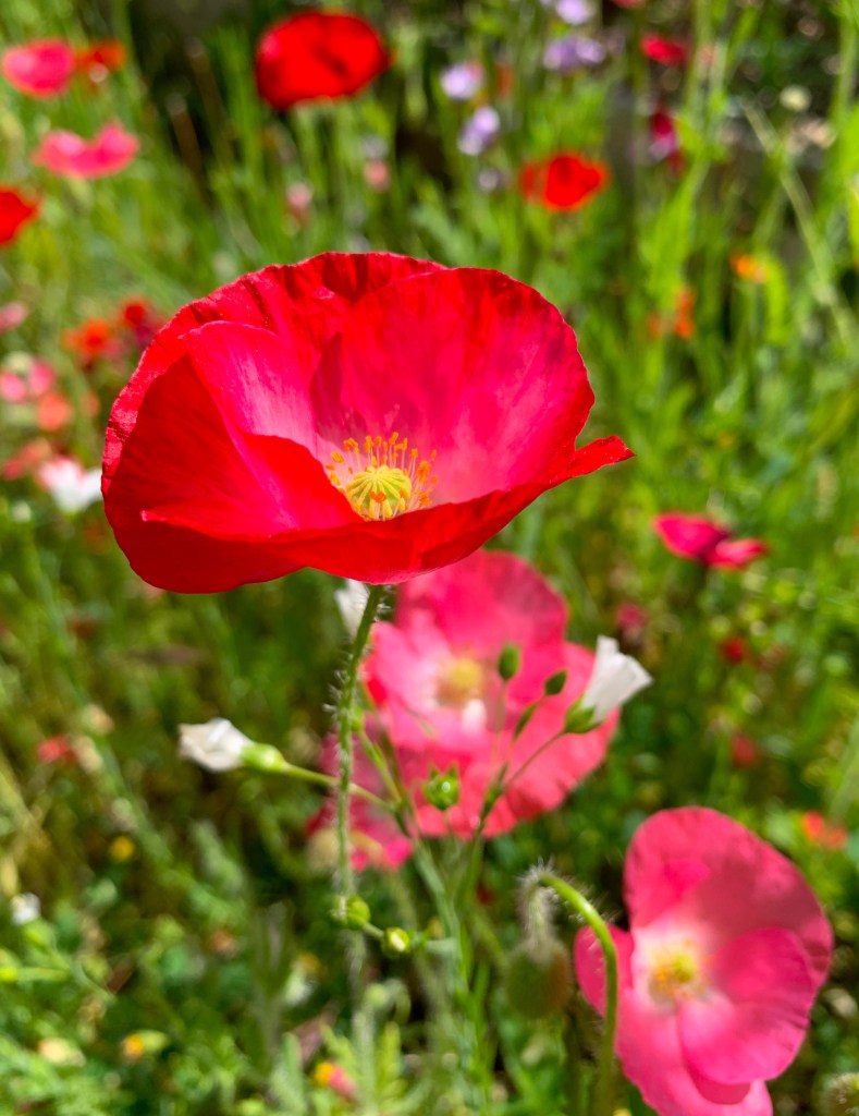 April warmed up and after a wet March everything is growing! Wildflowers along with other plantings are blooming in abundance. The California poppies and lupines do a great job of spreading themselves around the whole garden. We also encourage the Shirley Poppies in shades of red and pink. Color all around.
