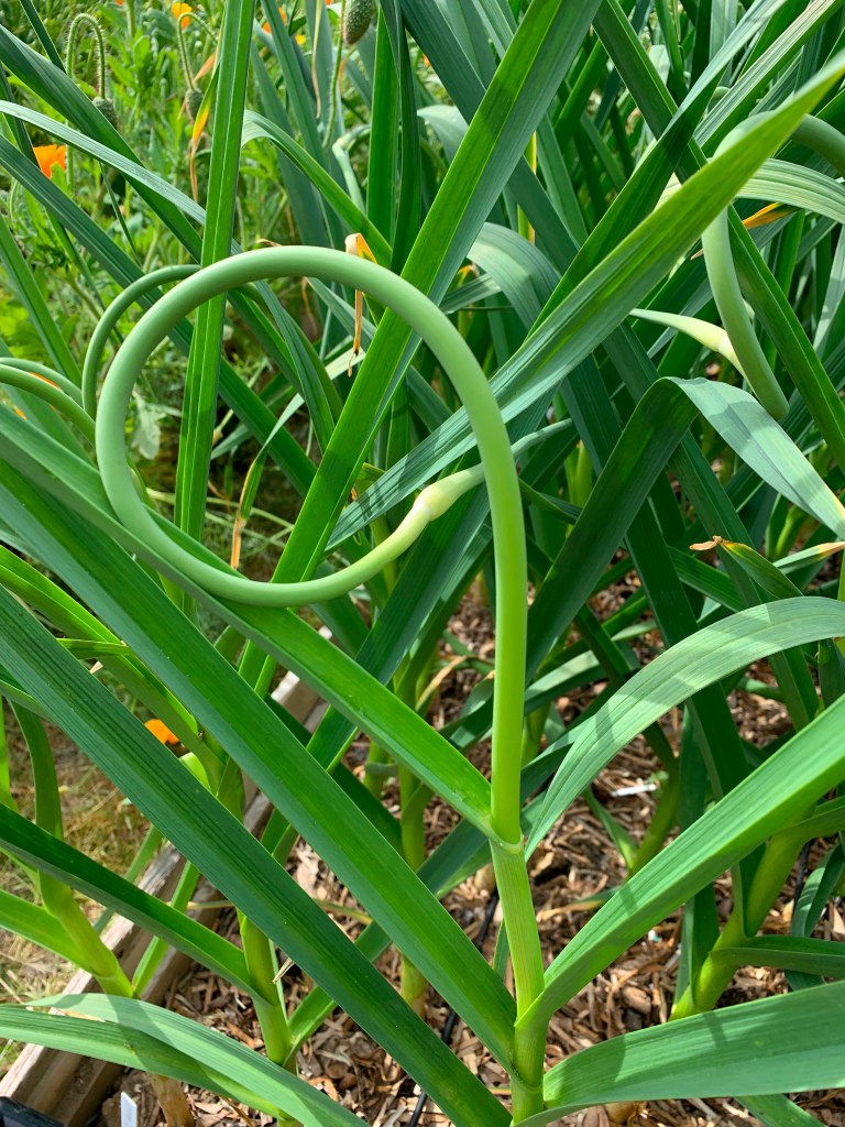 Garlic scapes are a rare delicacy. Hard to find unless you grow your own hardneck garlic. The scapes are the flower stalk produced by garlic in late spring. We cut or snap off the scapes to focus growth into the garlic bulb. Those trimmings are a tasty treat with a nice mild garlic flavor. Harvest them just when they start making their curli-Q.