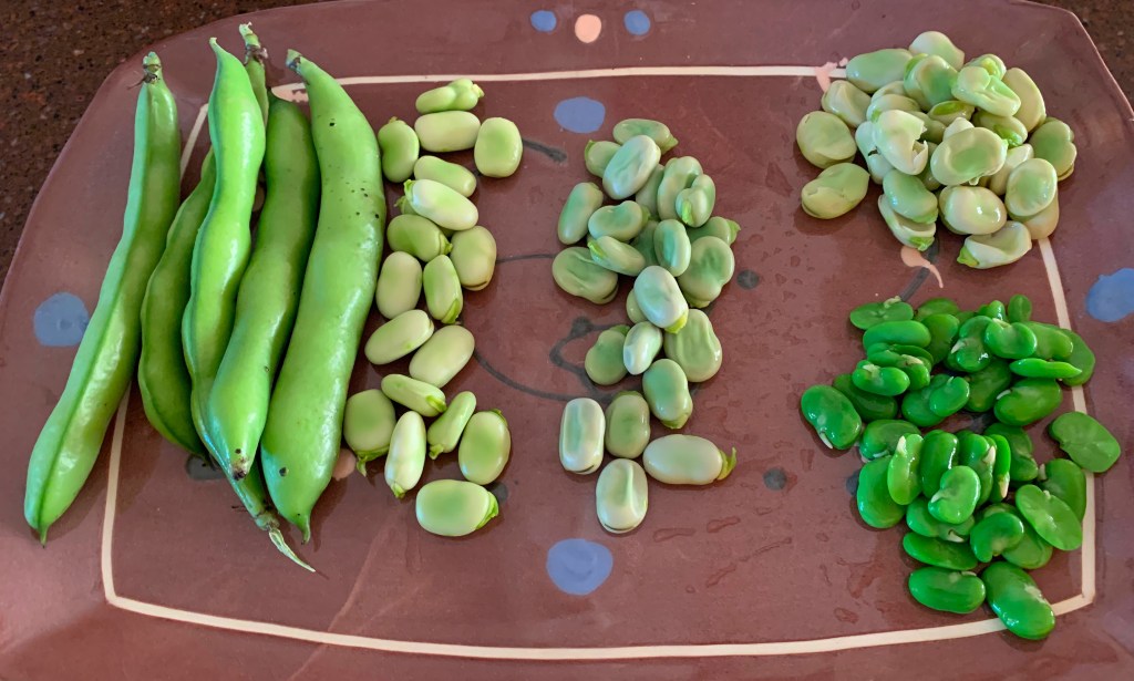The photo below shows the stages going from left to right with full pods, shelled beans, blanched beans, and finally beans on the bottom with empty skins above.