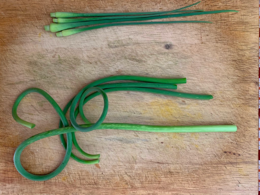 Garlic scapes are simpler to prepare. The tips of the scapes get a bit tough, so we chop off the tips from just below the flowering part.