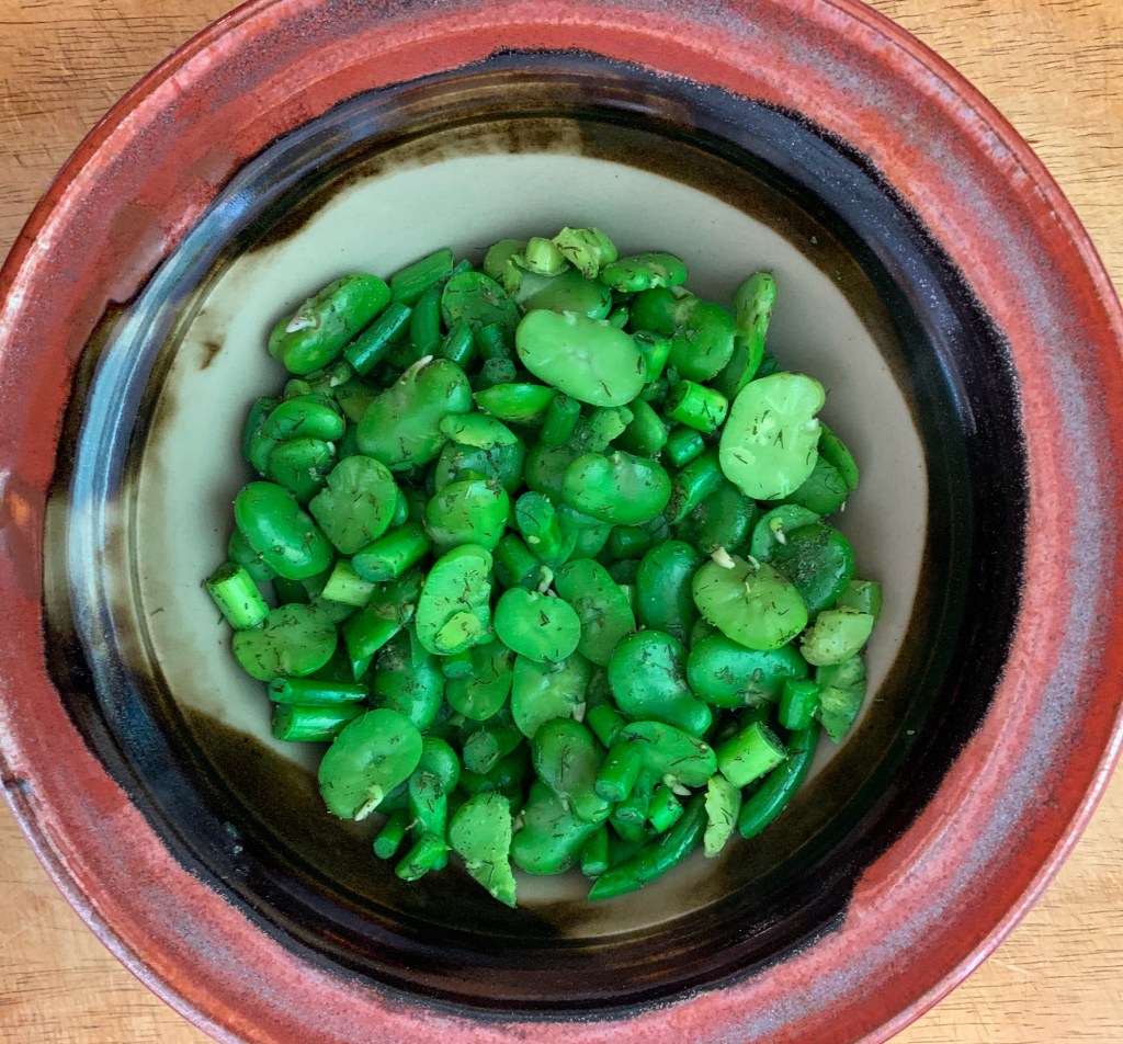 Heat a sauté pan on medium heat, add the olive oil then peeled fava beans and chopped garlic scapes. Briefly stir, add dill weed and sauté about 3 minutes until everything is hot. Add salt and pepper as desired.