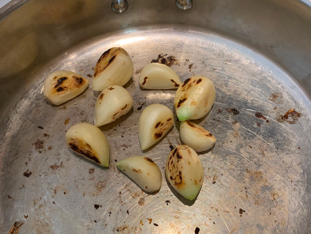 Roast the garlic. With our warm summer weather, we roasted them in a dry pan. A small dash of olive oil would work as well. Peel the garlic cloves (we had 10 large cloves) and place in a pan on medium low heat and cover the pan. About 10 to 15 minutes will give nicely roasted garlic. Stir occasionally and adjust heat if needed to avoid burning. They will soften slightly and get nicely browned in spots.