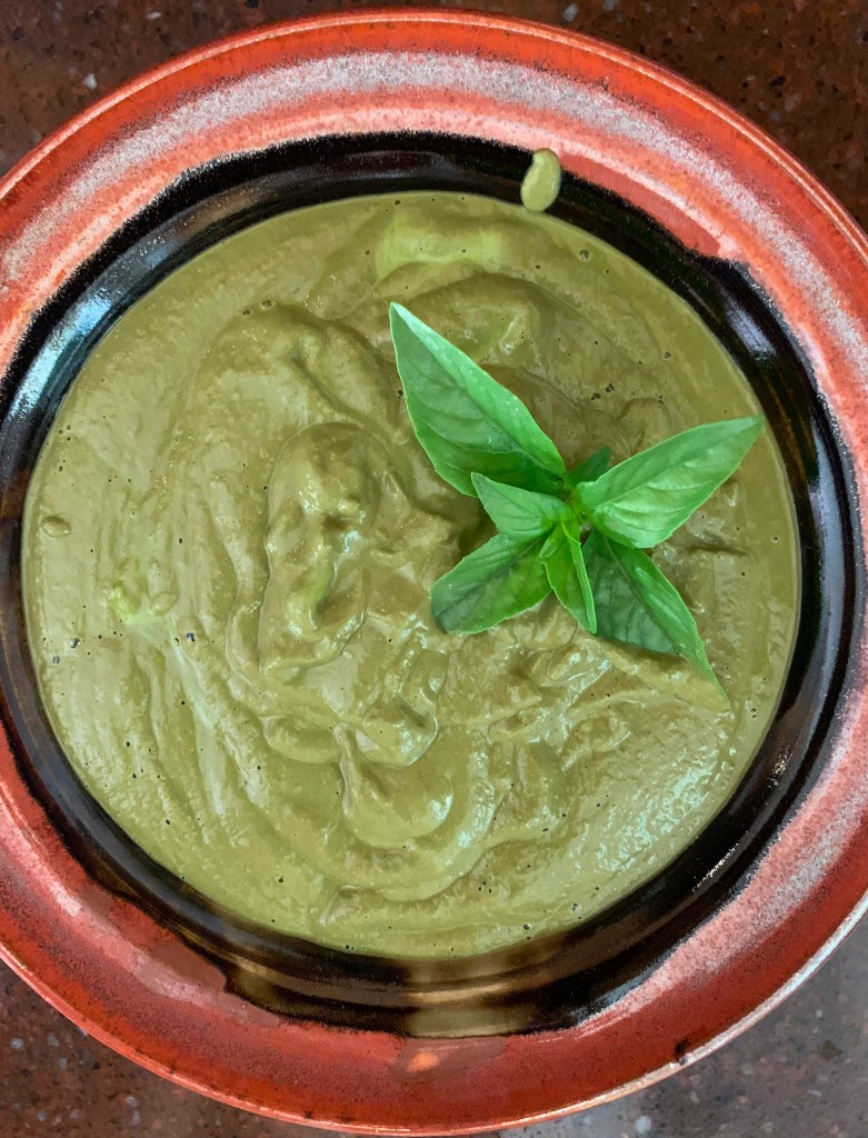 Dips and sauces are a big part of our regular menu, so when presented with great garlic and basil we came up with a pesto flavor, but in a smooth creamy consistency. Roasting the garlic mellows out the flavor, but those wanting that tingling “bite” of raw garlic can add raw as well as roasted to get the best of both.