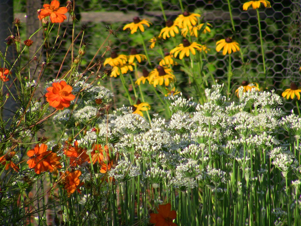 The bright orange cosmos and sunny yellow of the black-eyed Susan flowers make a nice background for all the white garlic chive flowers coming into full bloom this month.