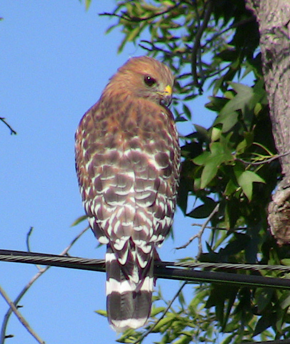 These hawks have distinctive markings with black and white stripes on the tail and deep rusty red shoulders and chest. Quite handsome creatures and we hope they keep our squirrel pests from hanging around too much!