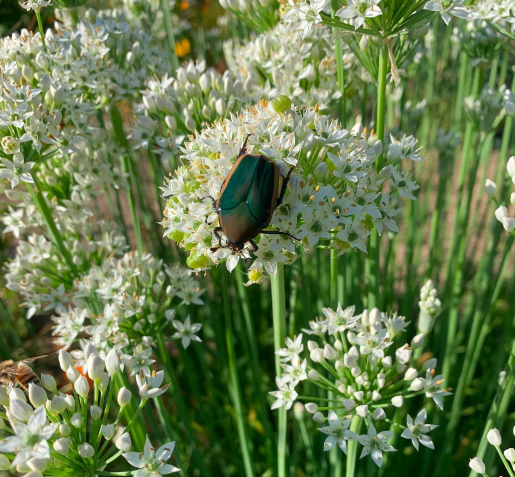 Late summer is when we see these colorful metallic green fig beetles around the garden. They are related to June bugs that many of you may be familiar with. This year we have seen them on the chive flowers a few times. They have a reputation for liking very ripe, or even rotting, fruit (like figs). They don’t have the “teeth” for biting fruit so they don’t bother our figs (unless they are well past what we’d eat anyway).