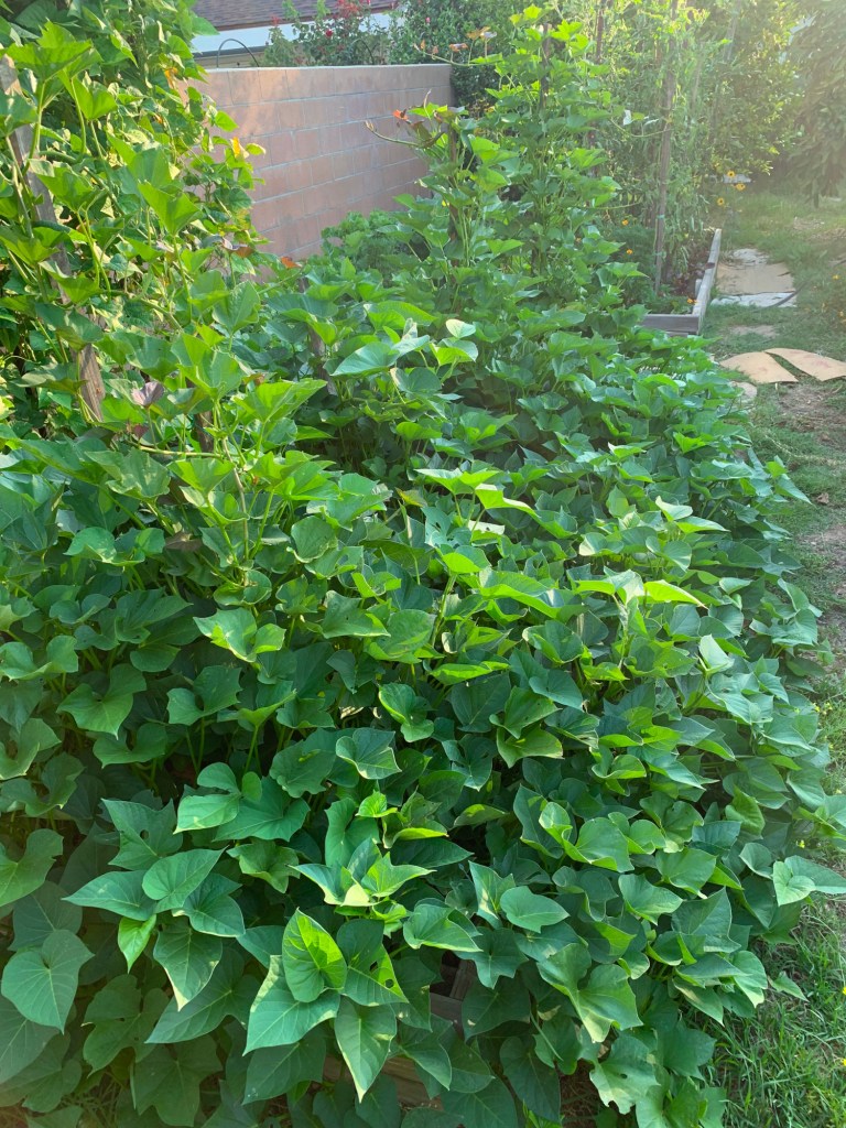 They both share a vining characteristic. Our sweet potatoes keep trying to spread over more of the garden while we tie them up to stakes so they don’t take over the neighboring garden beds.