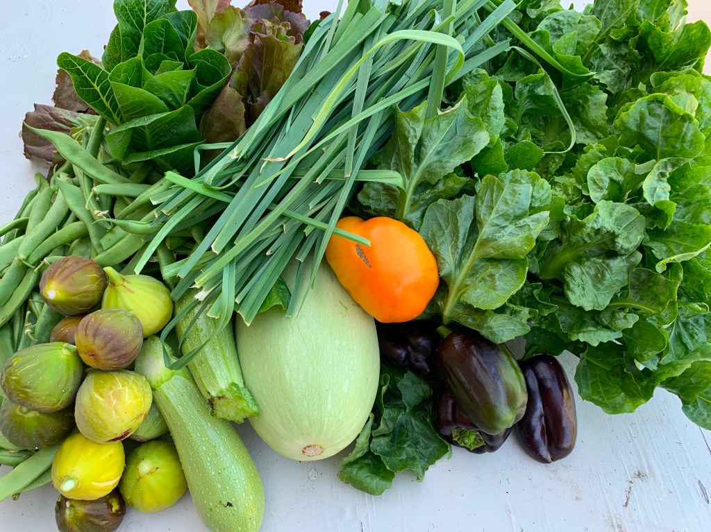 In this photo we have figs, green beans, lettuce, tareh (garden leeks), escarole, bell peppers, tomato and summer squash in this day’s harvest. All those good summer crops are going strong with the green beans and summer squash topping the list.