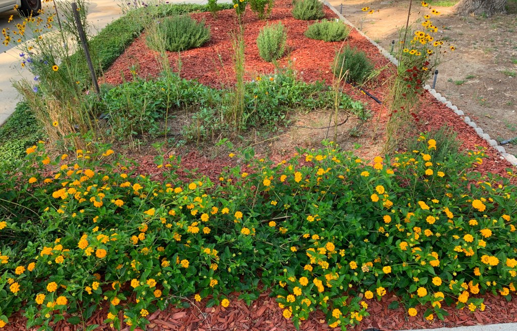 Our test of replacing part of our front lawn with drought tolerant landscaping is filling out nicely. The 3 lantana plants we put in the front have done quite well in covering nearly 20 feet (about 6 meters). Behind the yellow flowered lantana is a wildflower bed that was quite full and now in late summer the coreopsis is the main flower still blooming. Then we have a few lavender and rosemary plants that are growing well. On the left side of this photo is a strip of potentilla ground cover. We planted one plant every 18 inches (about 50 cm) and they have spread well to fill in the whole space. We mow the top to keep them short and trim the edges every couple weeks to keep them looking neat and tidy.