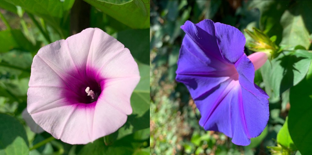 Sweet potatoes and morning glories are “cousins” in the Convolvulaceae family. The same tubular/funnel shaped flowers for both of them show their similarity with the lighter pink sweet potato flower and the darker purple for the morning glory. The flowers have noticeable creases where you can imagine how they were folded up in the bud before opening.