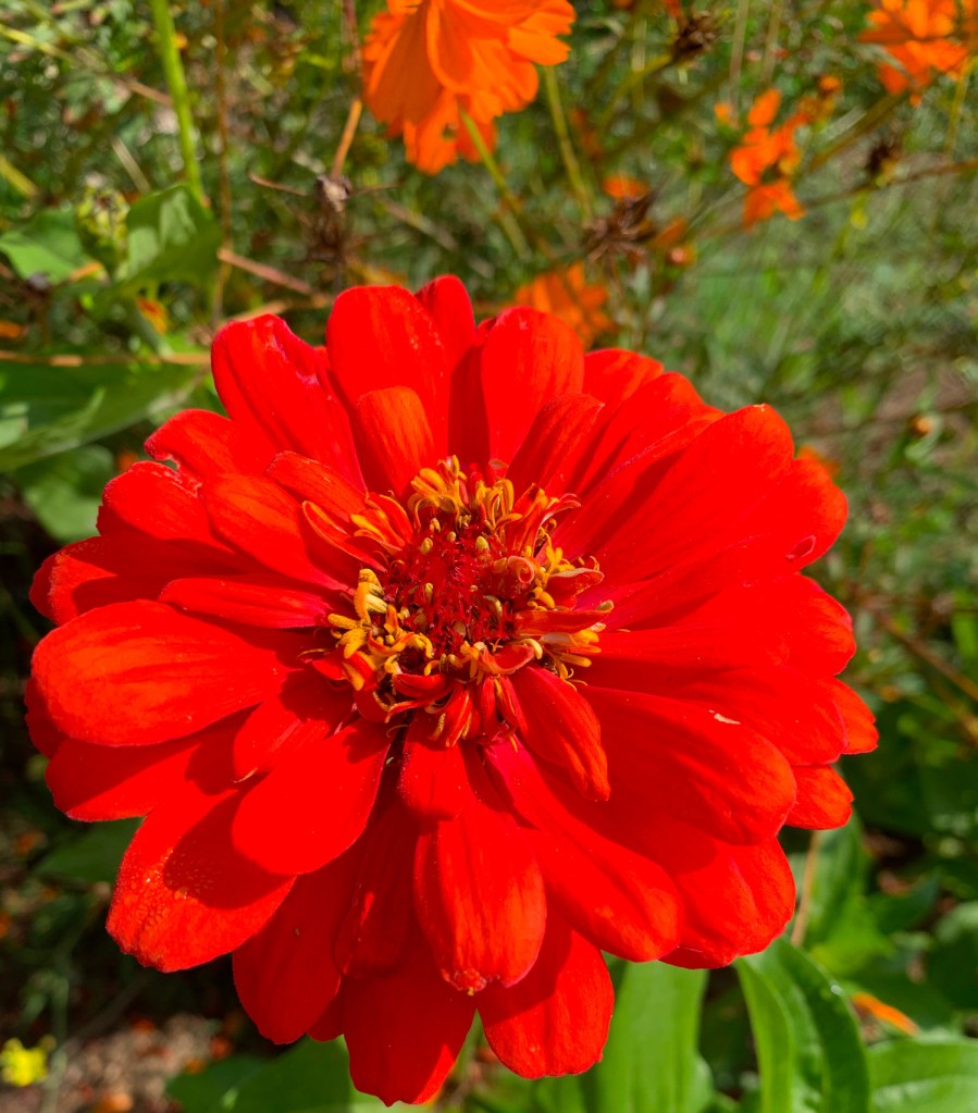 This bright red zinnia is one of many colors of zinnias adding color the the late summer garden. We planted zinnias late this year so they are just coming into full bloom in September. Our tropical storm back in August got some stray zinnia seeds (as well as others) to germinate. Looks like we’ll get some new zinnia flowers blooming in October and November.