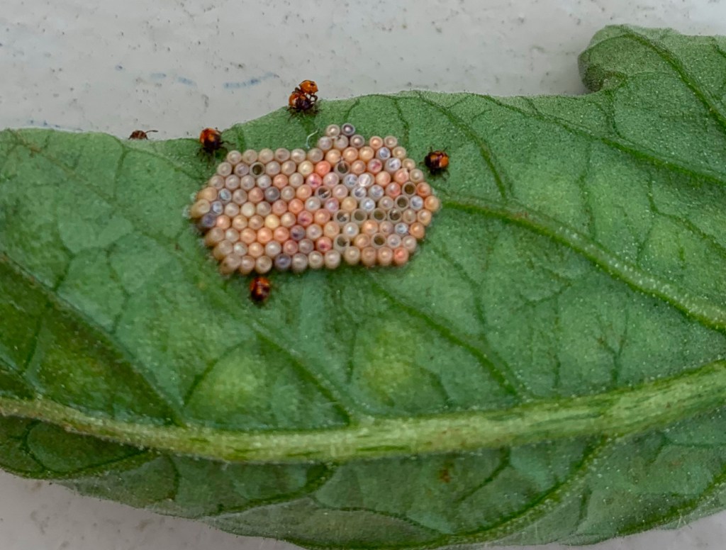 Finding a few bugs in the garden is not unusual. This group of insect eggs just hatching is something not usually noticed. These appear to be some species of stink bug (also called shield bugs), but not sure which one. Some stink bugs can be pests as they suck the juice from plants. We haven’t seen many of them, or damage from them. Maybe our dragonflies are doing a good job of hunting them before they get big!